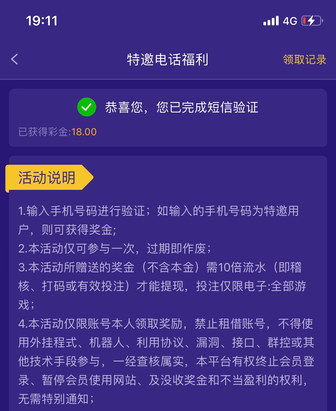 手机验证领18彩金,兄弟们可以去试试