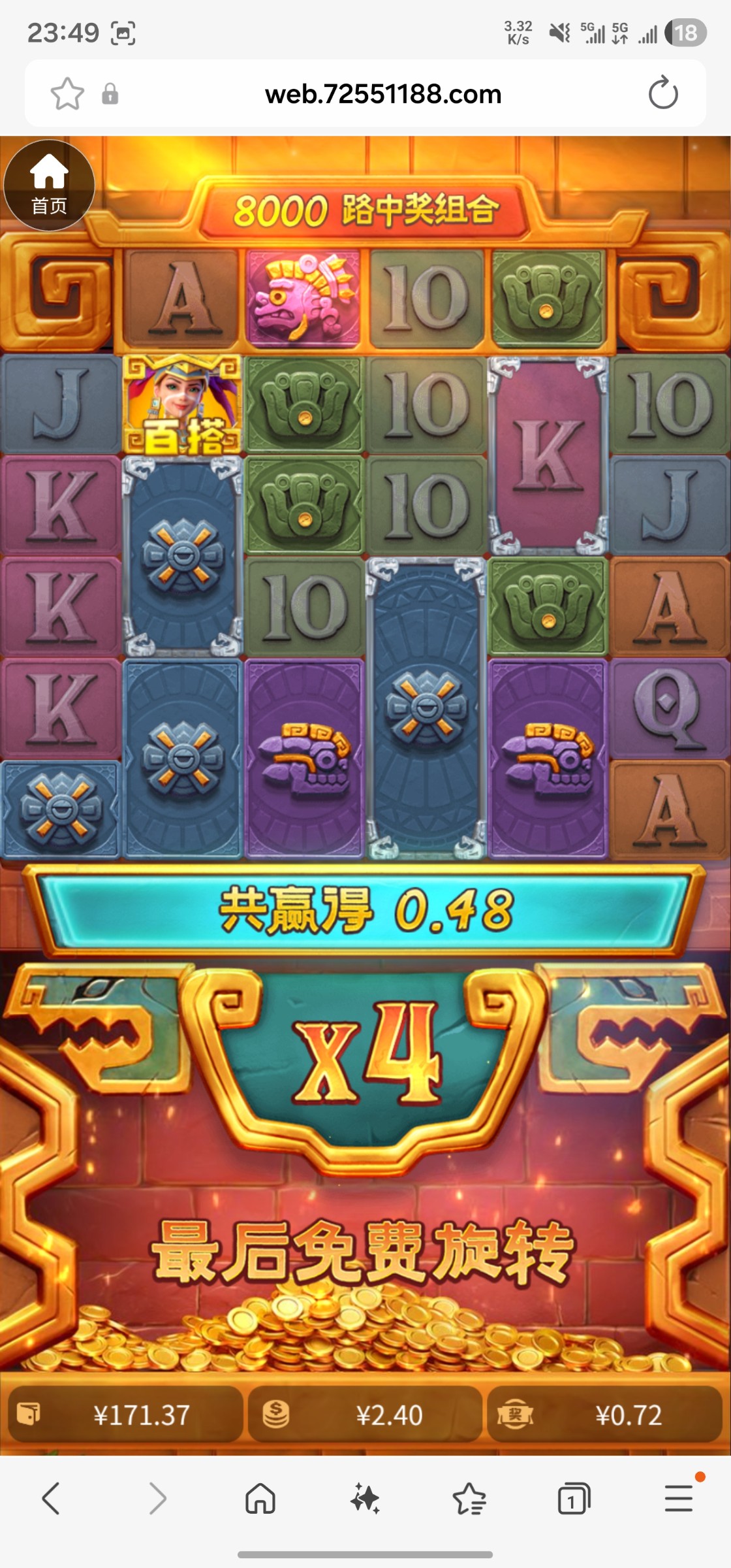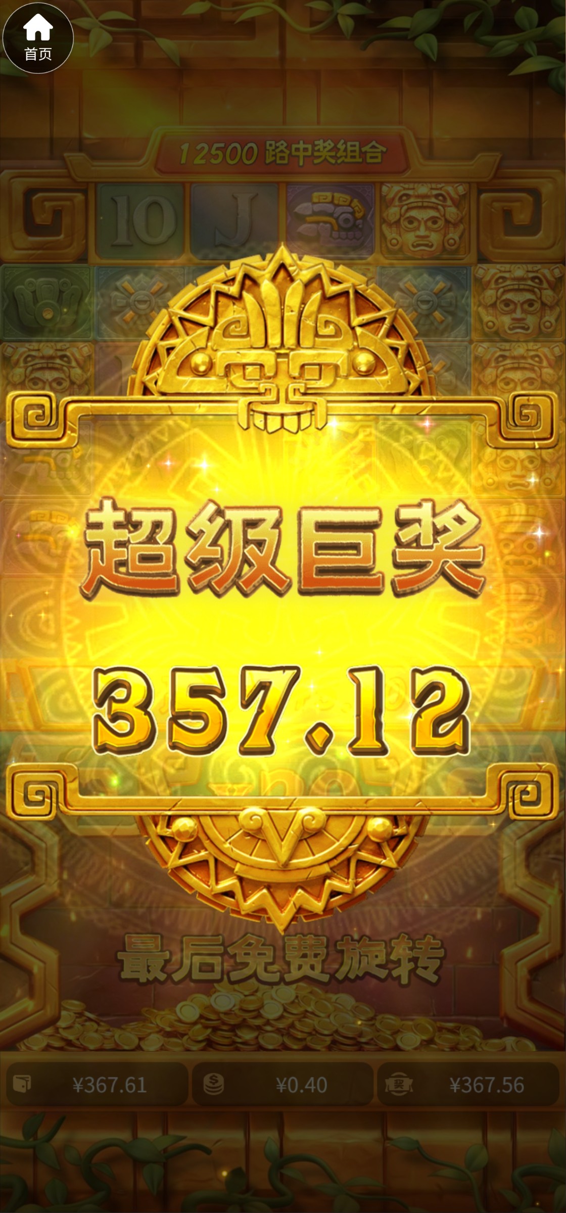 上了200,一直打黄金城,拉1.6,2块,2.4,3.2都进过免费,30倍都不给,剩了最后20,买了一发,给了个900倍,真TM气啊