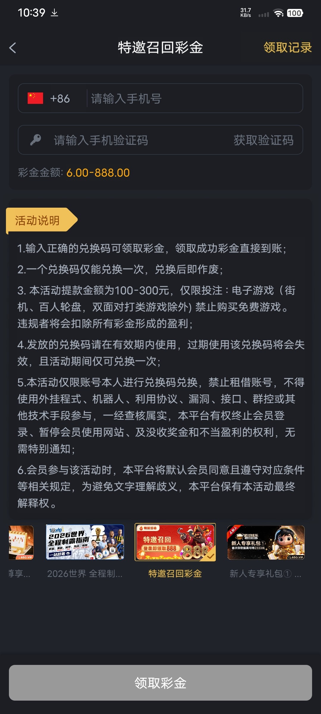 星球娱乐特邀召回6~888彩金,有想碰的老哥可以碰一下,打出来记得反馈