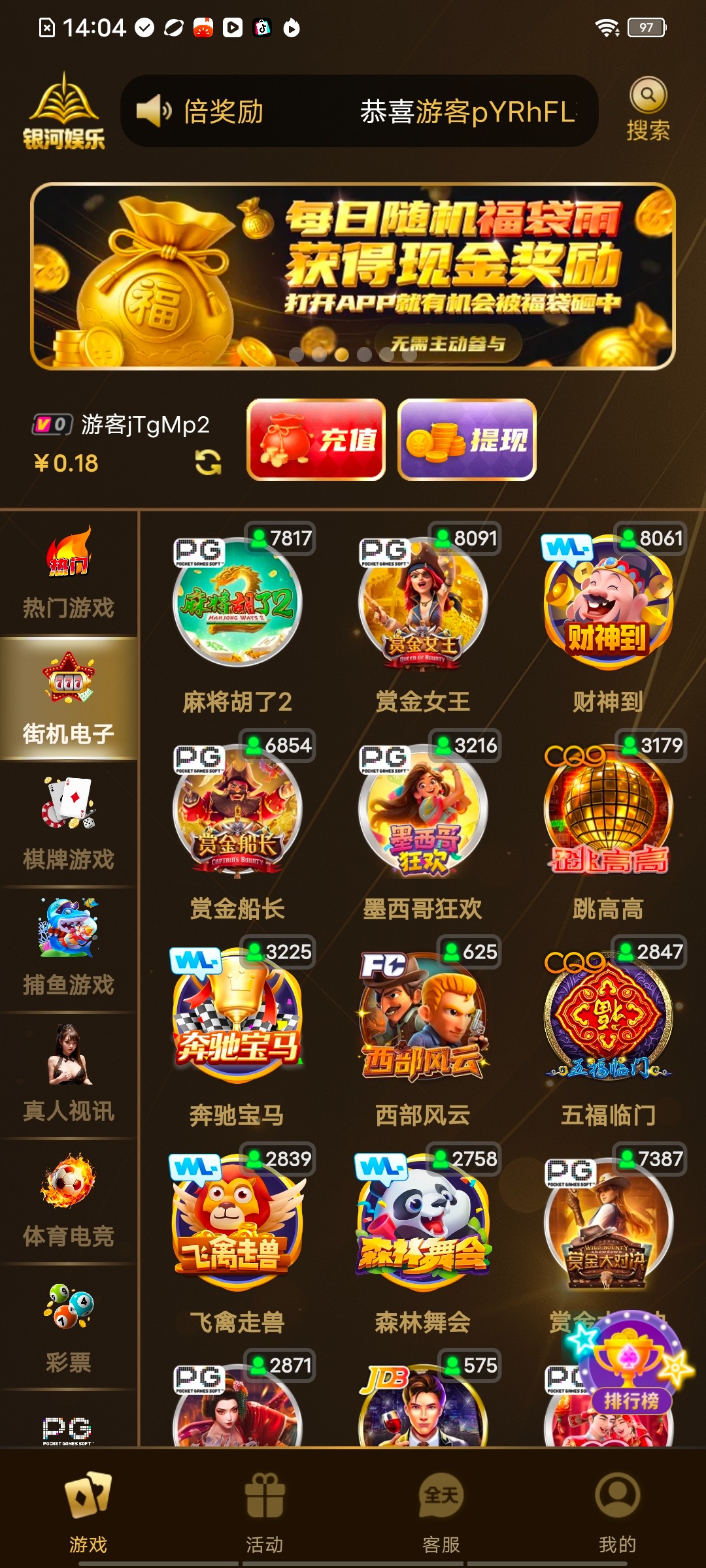 接到电话的,上去是游客号验证手机后有12,大家可以去碰下,严禁充值