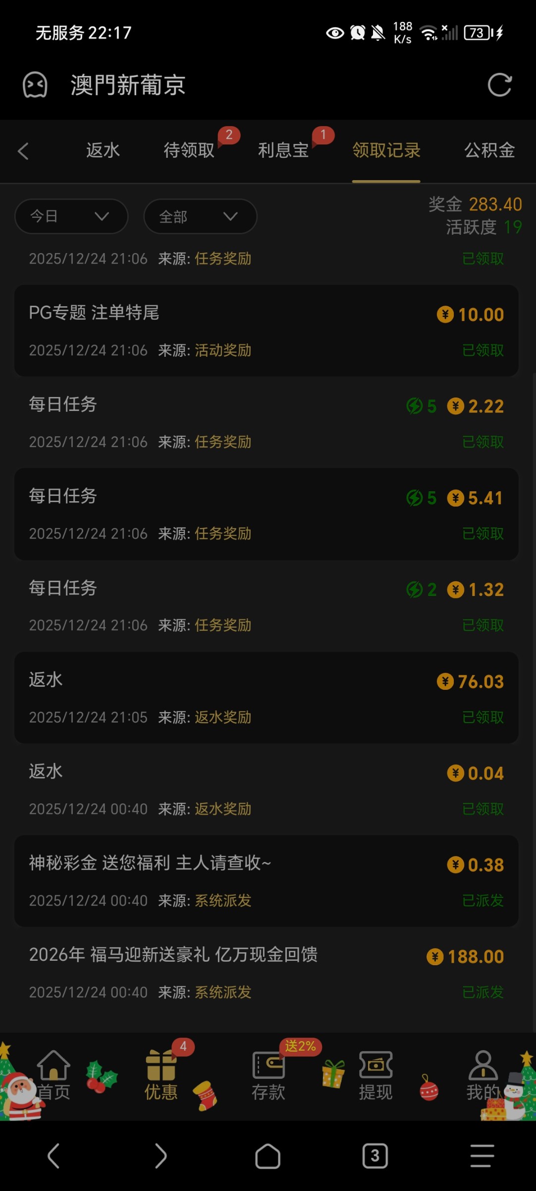 上去看了下之前玩过的平台,狗庄年终回馈了188,上了9000多,得吃了