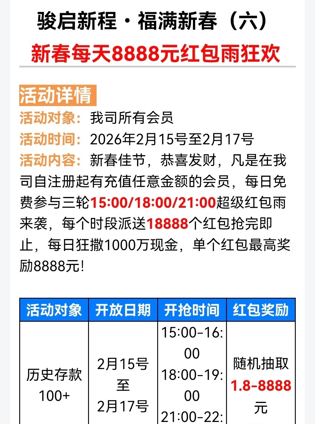 活动要求历史存款100元 每天三波红包雨15.00 18.00 21.00