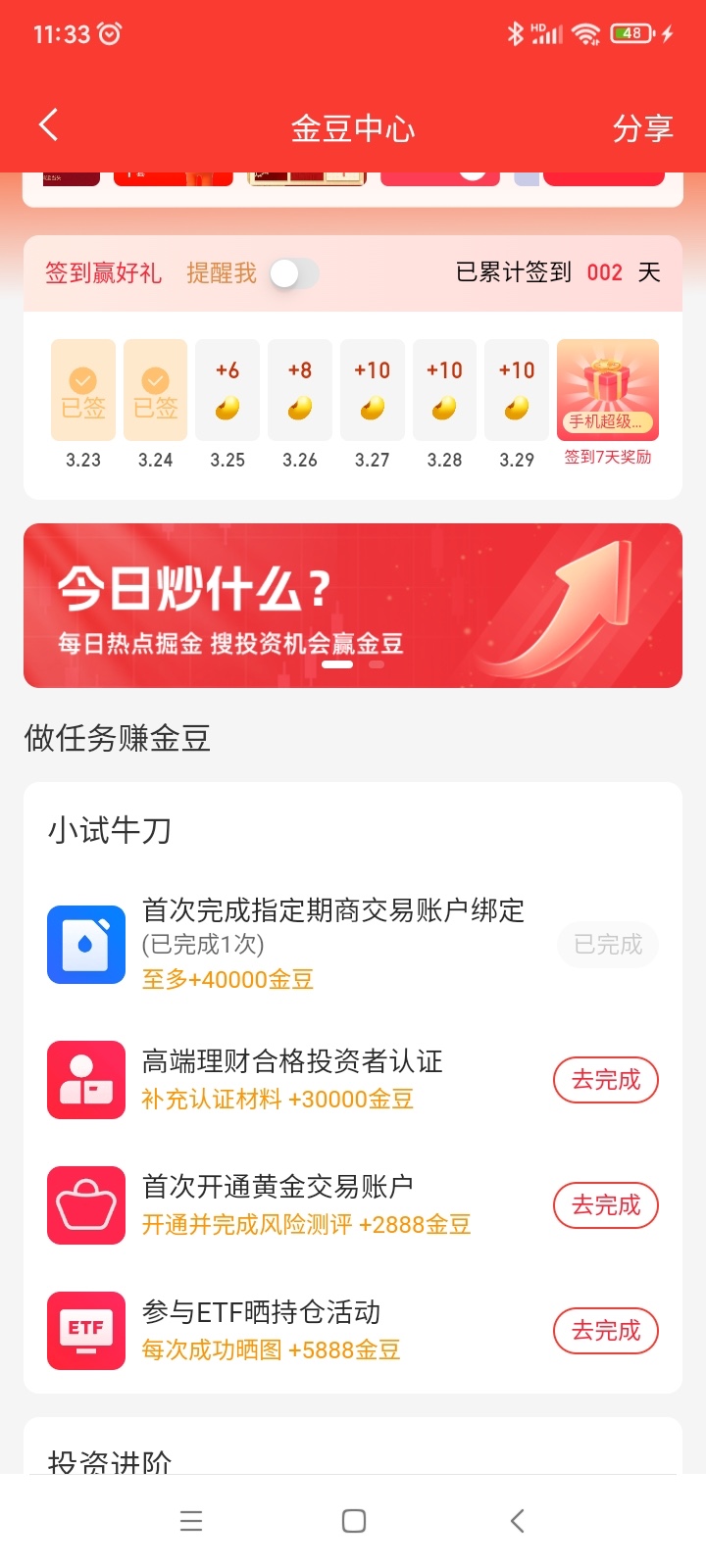 昨天有老哥发这个,撸高端理财合格投资者认证30元,太复杂,搞不来,我就去搞了首次完成指定期商交易账号绑定,撸了10,愿意搞得可以去搞。